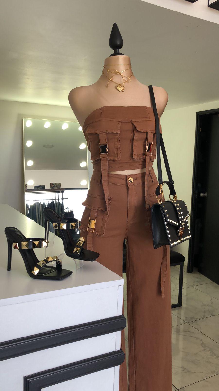Este conjunto de dos piezas Set Texas Cafe es perfecto para un look moderno y a la moda. El top con bolsos al frente y pantalón alto de pierna ancha te dan comodidad y estilo. ¡Ideal para cualquier ocasión!
