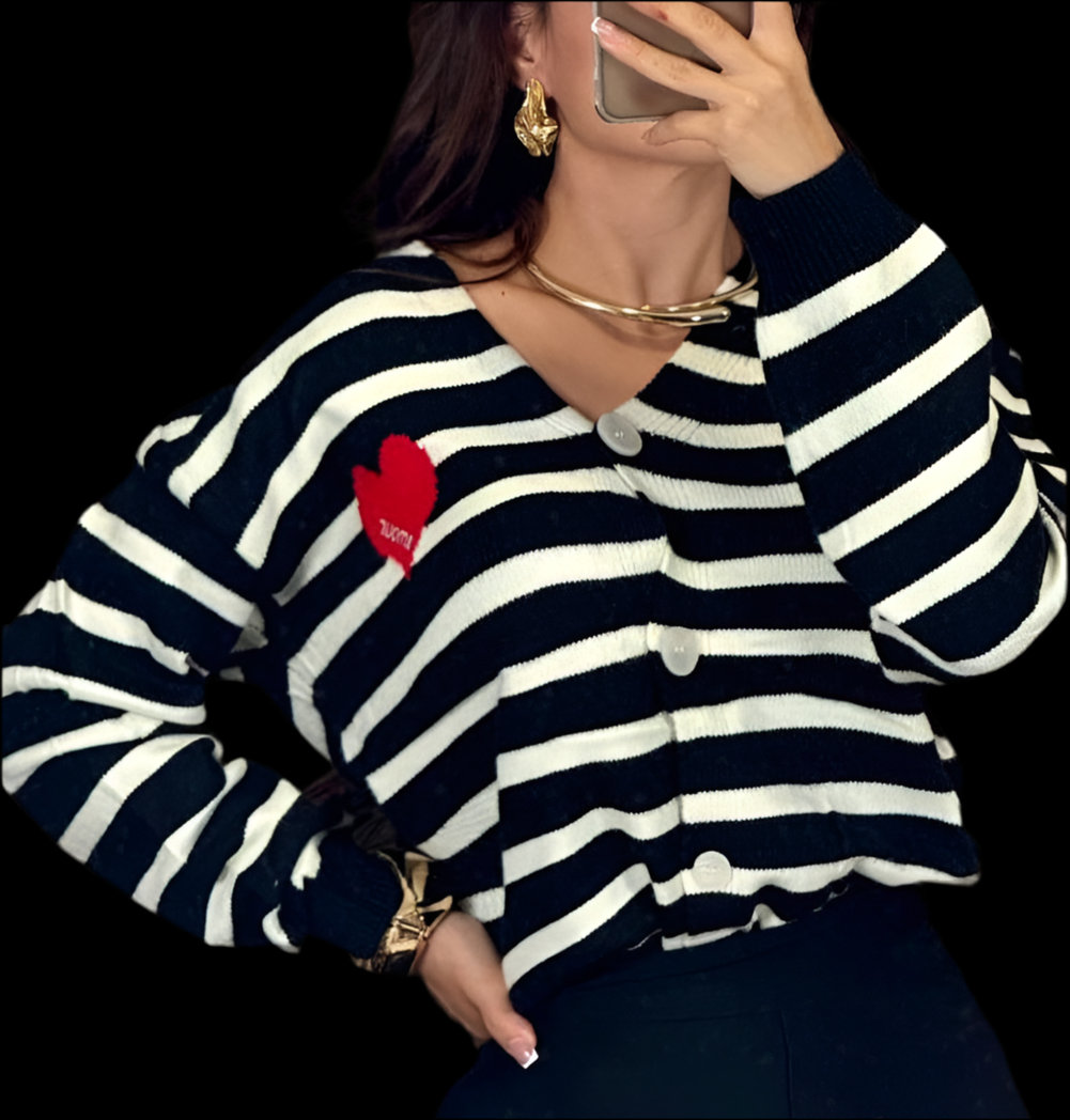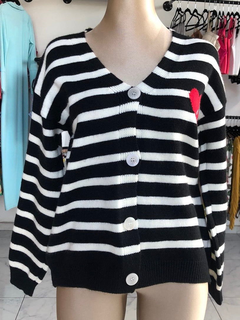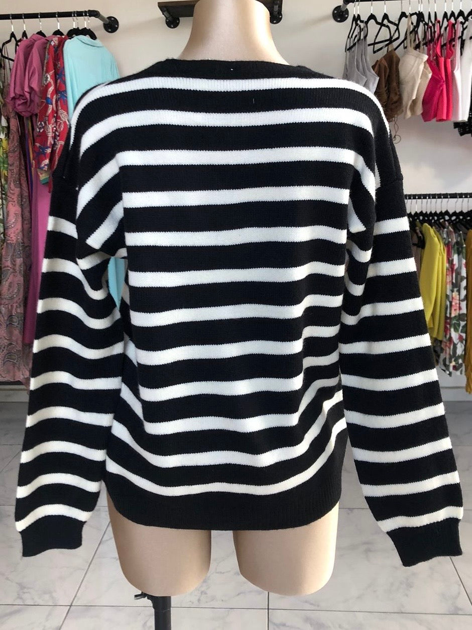 Disfruta del invierno con estilo y comodidad gracias a nuestro suéter tejido negro con diseño rayado y botones. Su material cálido te mantendrá abrigado en los días fríos y su suave textura te brindará un confort inigualable. Combínalo con cualquier outfit para un look casual y chic. ¡El complemento ideal para esta temporada!