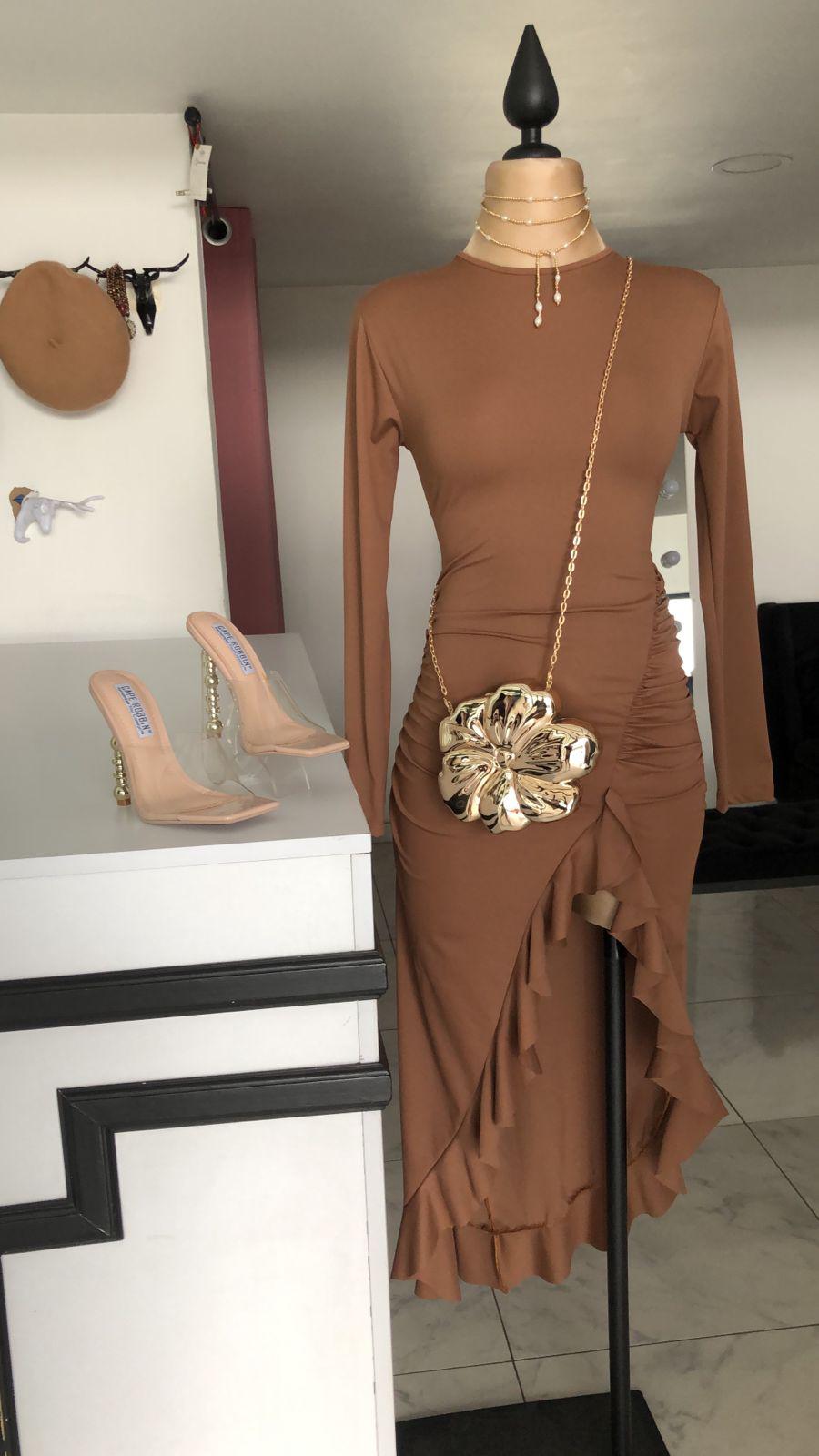 Este elegante vestido manga larga en color marrón tiene un cuello de tortuga y una tela que se estira de forma increíblemente cómoda. Con una abertura en la pierna y detalles de olanes, te verás increíblemente elegante y a la moda. ¡Aprovecha ahora y luce fabulosa con este vestido único!