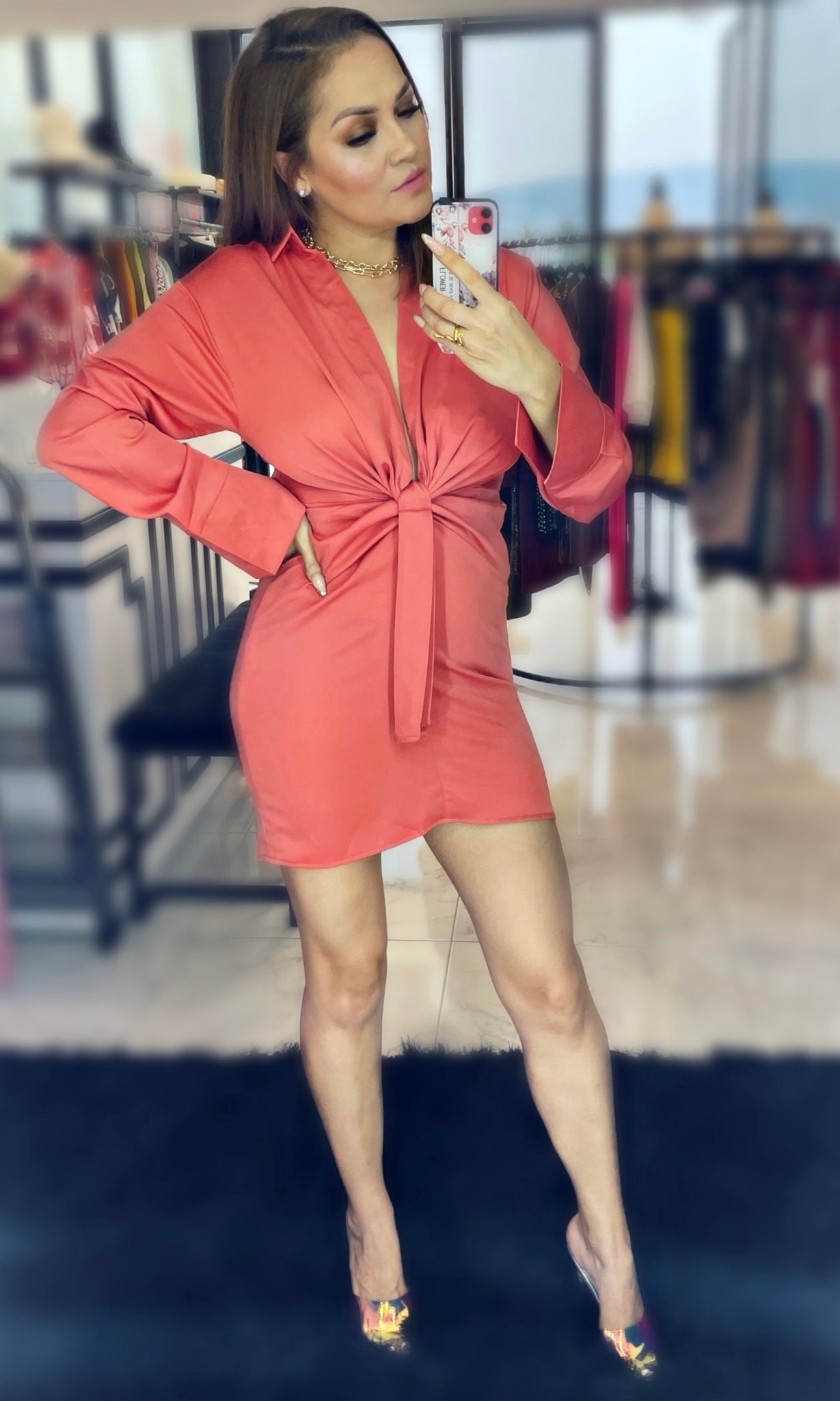 Vestido salmon con escote pronunciado